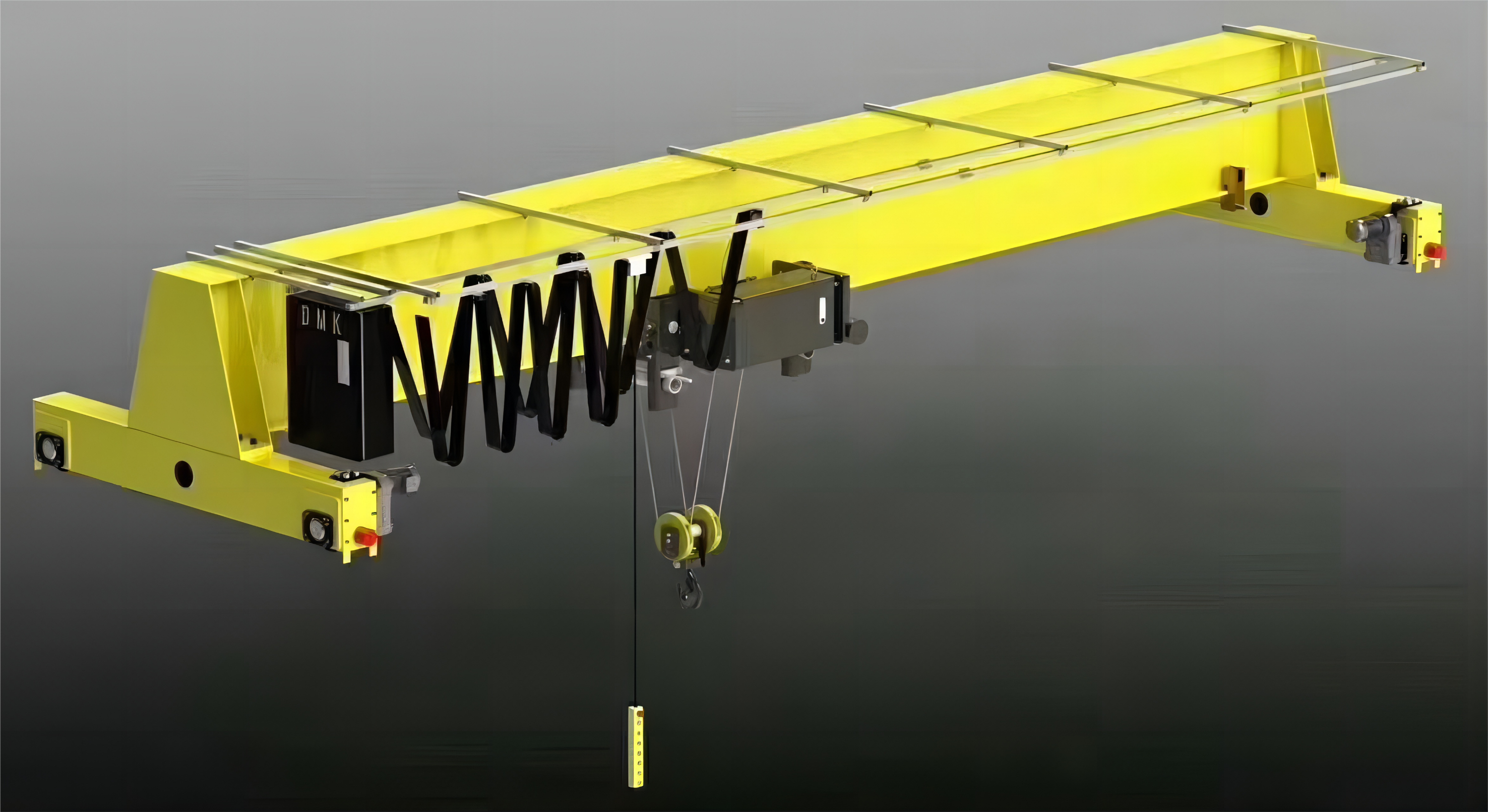 歐式單梁橋式起重機是我公司在引進和消化國外先進技術的基礎上,以模塊化設計理論為指導,以現(xiàn)代計算機技術為手段,引入優(yōu)化設計及可靠性設計方法,采用進口配置、新材料、新工藝完成的具有輕量化、通用化、節(jié)能環(huán)保、免維護及高技術含量的新型起重機。主梁及端梁為焊接箱型梁結構,下翼緣板作為電動葫蘆運行軌道,主梁與端梁采用高強度螺栓聯(lián)接,便于運輸及現(xiàn)場安裝。起升機構采用歐式電動葫蘆,結構緊湊,易于維護。